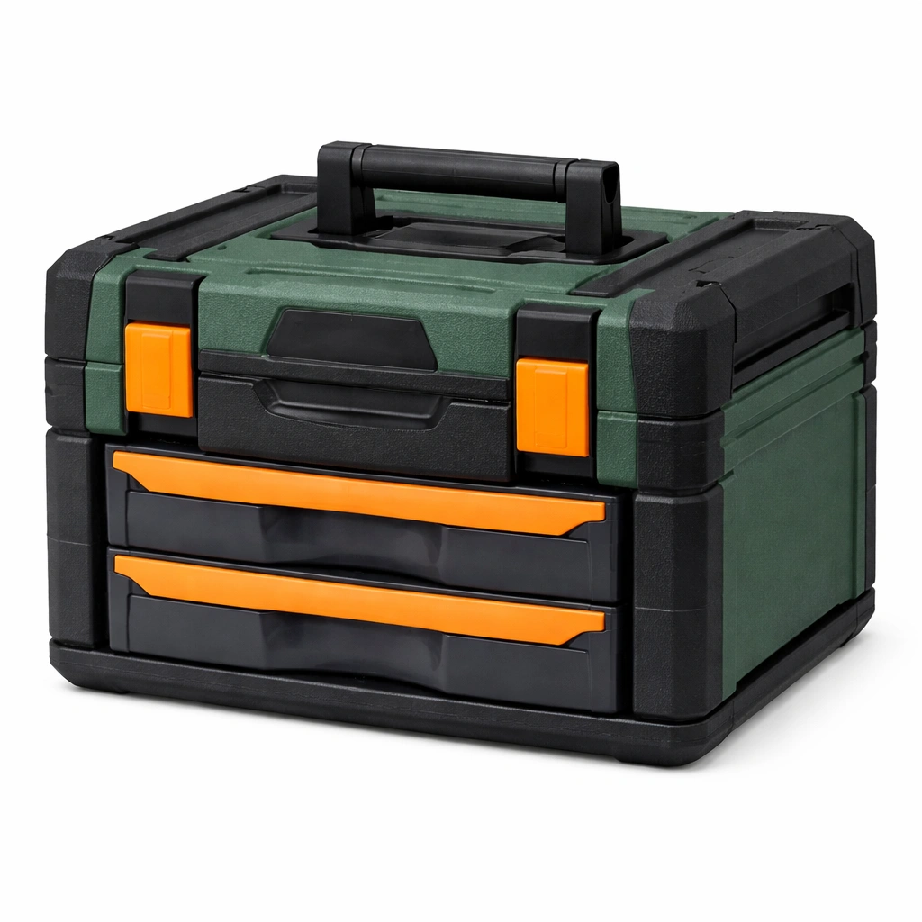 Werkzeugkiste Kunststoff Grün Orange Schwarz mit 2 Schubladen
