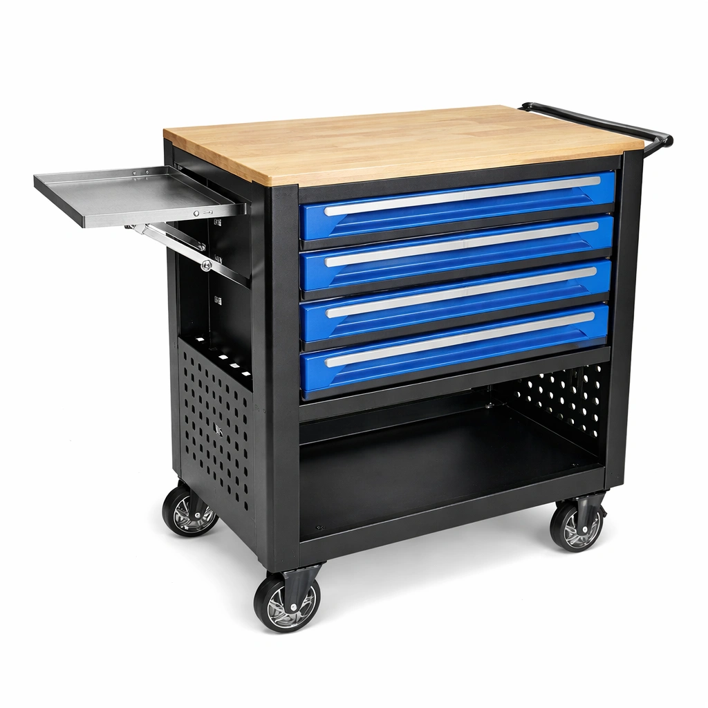 Werkzeugwagen Stahl Blau mit Holzplatte und Schubladen