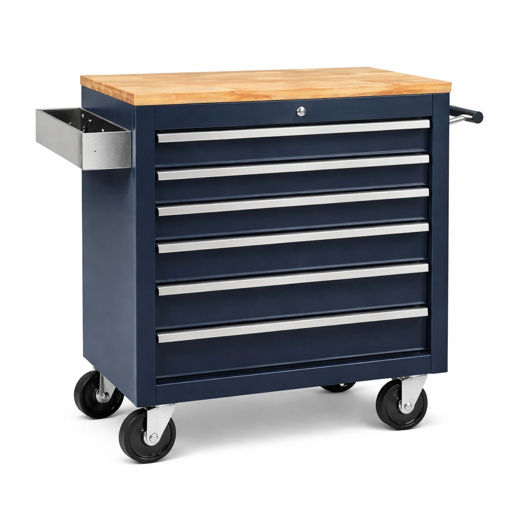 Werkzeugwagen Stahl Holz Blau mit 7 Schubladen