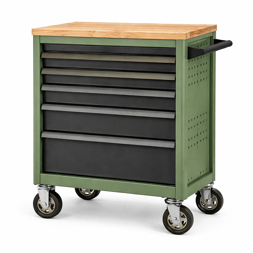 Werkzeugwagen Metall Grün Schwarz mit Holzabdeckung und 7 Schubladen
