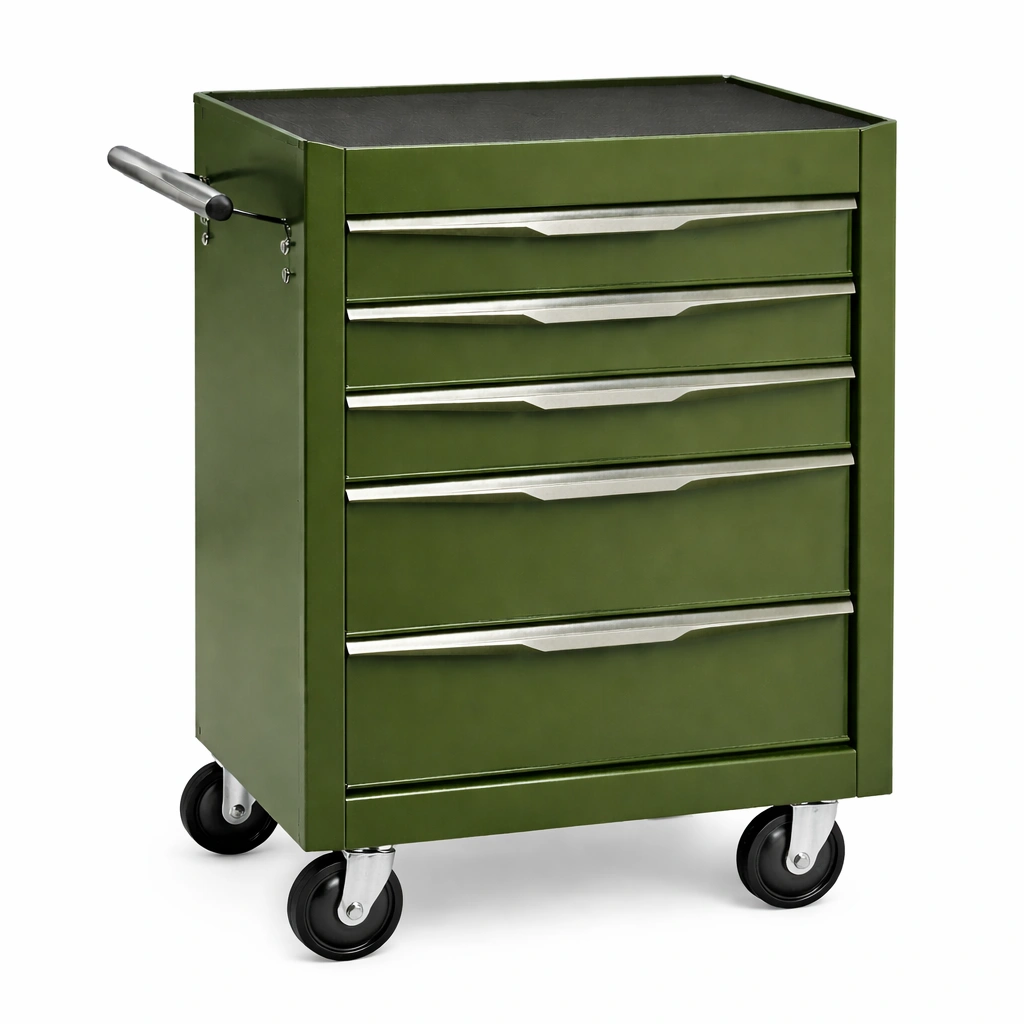 Der Werkzeugwagen besteht aus pulverbeschichtetem Stahl für Langlebigkeit. Er ist mit fünf Schubladen ausgestattet, die genügend Platz für Werkzeuge bieten. Jede Schublade hat eine robuste Metallführung mit einer Tragkraft von bis zu 10 kg. Der Wagen verfügt über stabile Rollen und einen seitlichen Griff, der die Mobilität erleichtert. Eine Verriegelungsvorrichtung bietet zusätzliche Sicherheit.