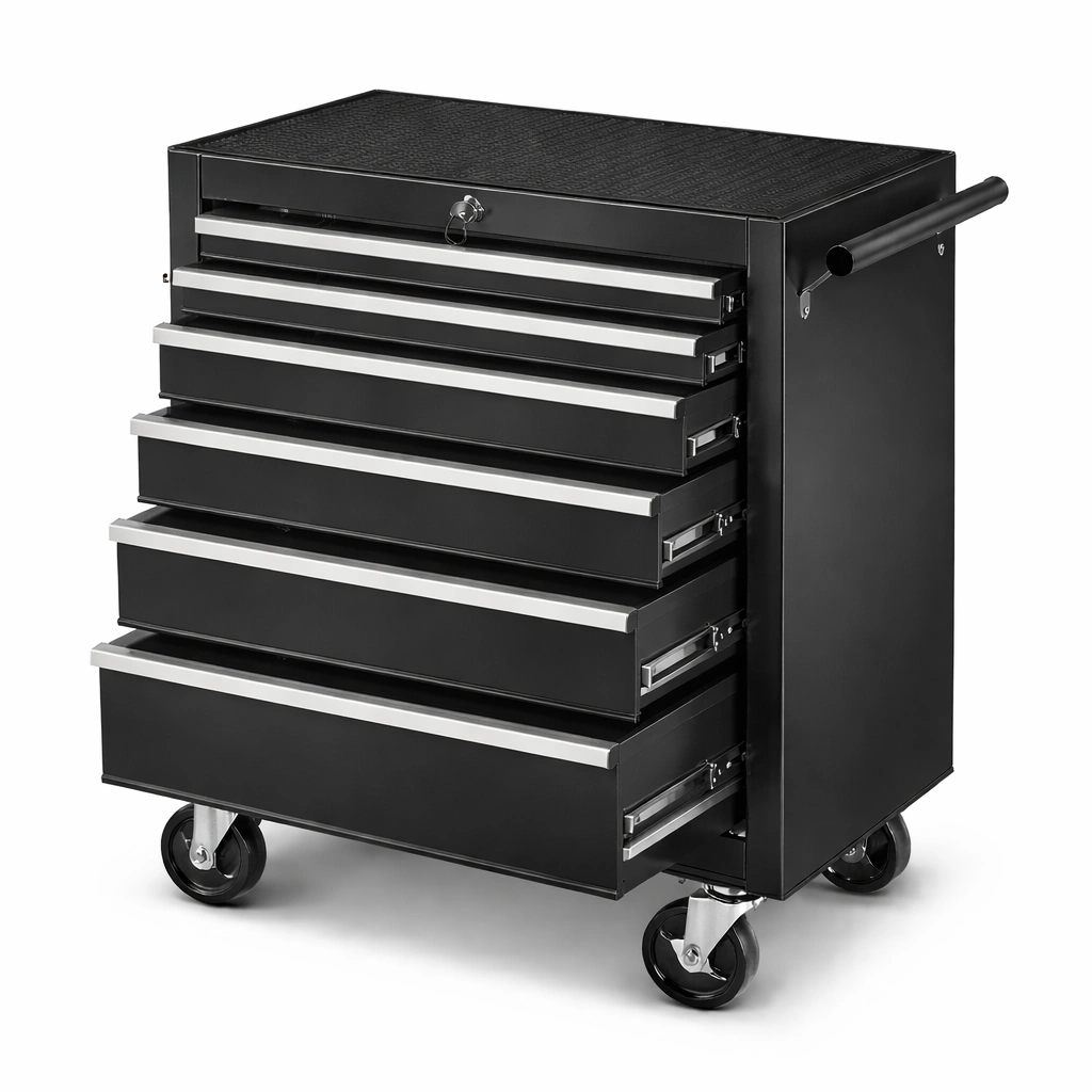 Schwerlastige Konstruktion mit sechs Schubladen und einem abschließbaren Fach zur sicheren Aufbewahrung von Werkzeugen